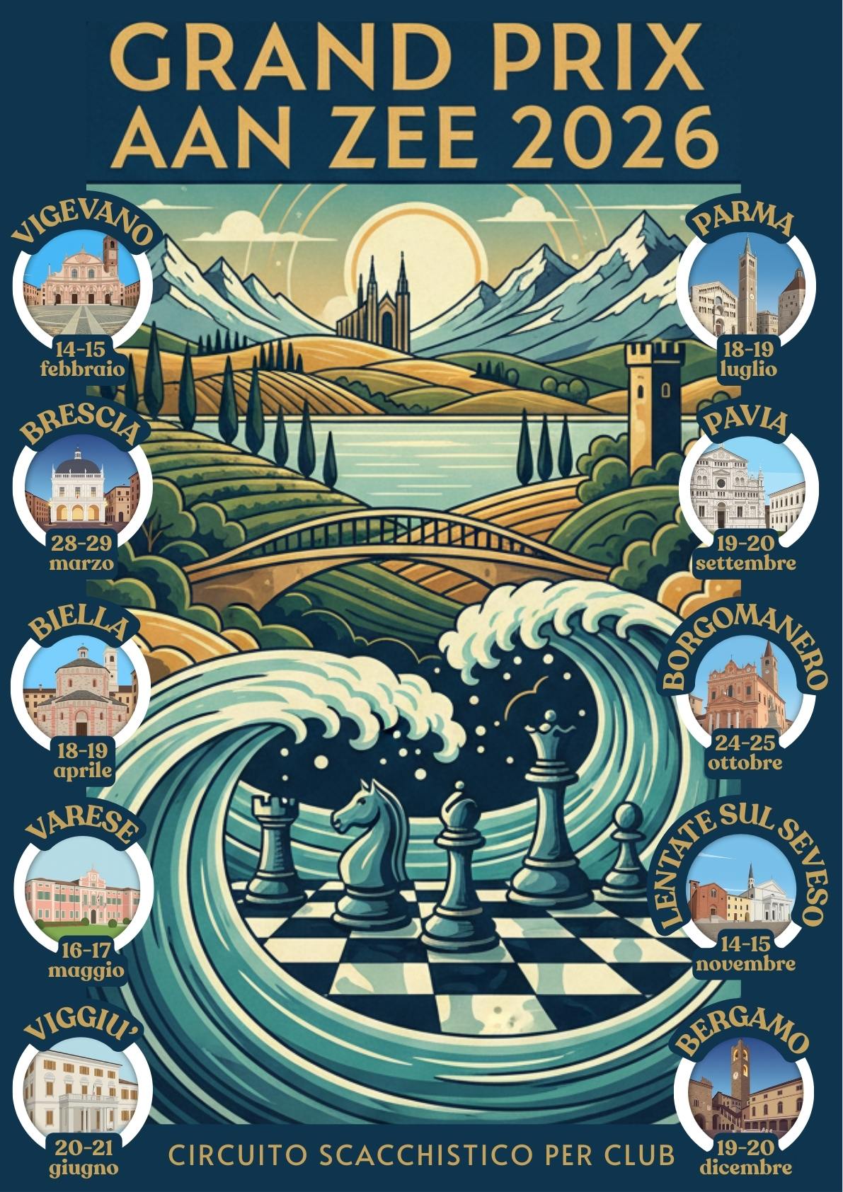 Il GRAND PRIX AAN ZEE 2026 si preannuncia colossale, superando ogni aspettativa. Dopo il successo del 2025 con 6 tappe, l'edizione 2026 esagererà con un tour scacchistico di ben 10 tappe che attraverserà il Nord Italia. Una vera e propria Formula Perfetta attende i partecipanti: tornei a Gironi all'Italiana (Round Robin) da 6 giocatori, garantendo sfide equilibrate e intense (60' + 30").